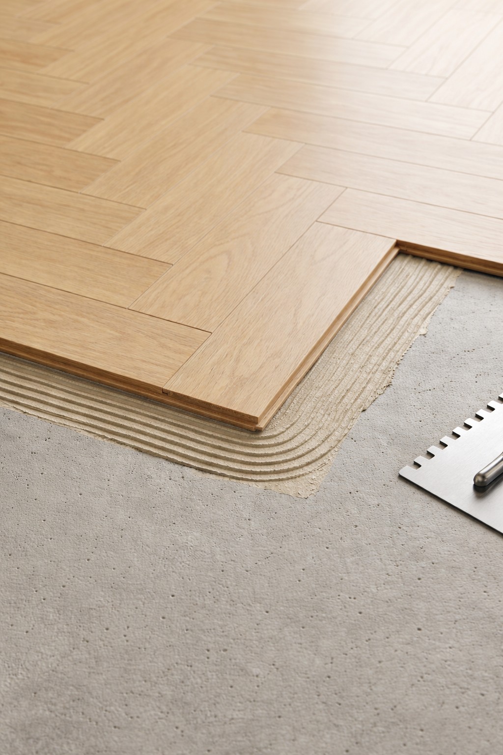 Dann empfehlen wir eine vollfächige Verklebung von Fertigparkett mit Klicksystem