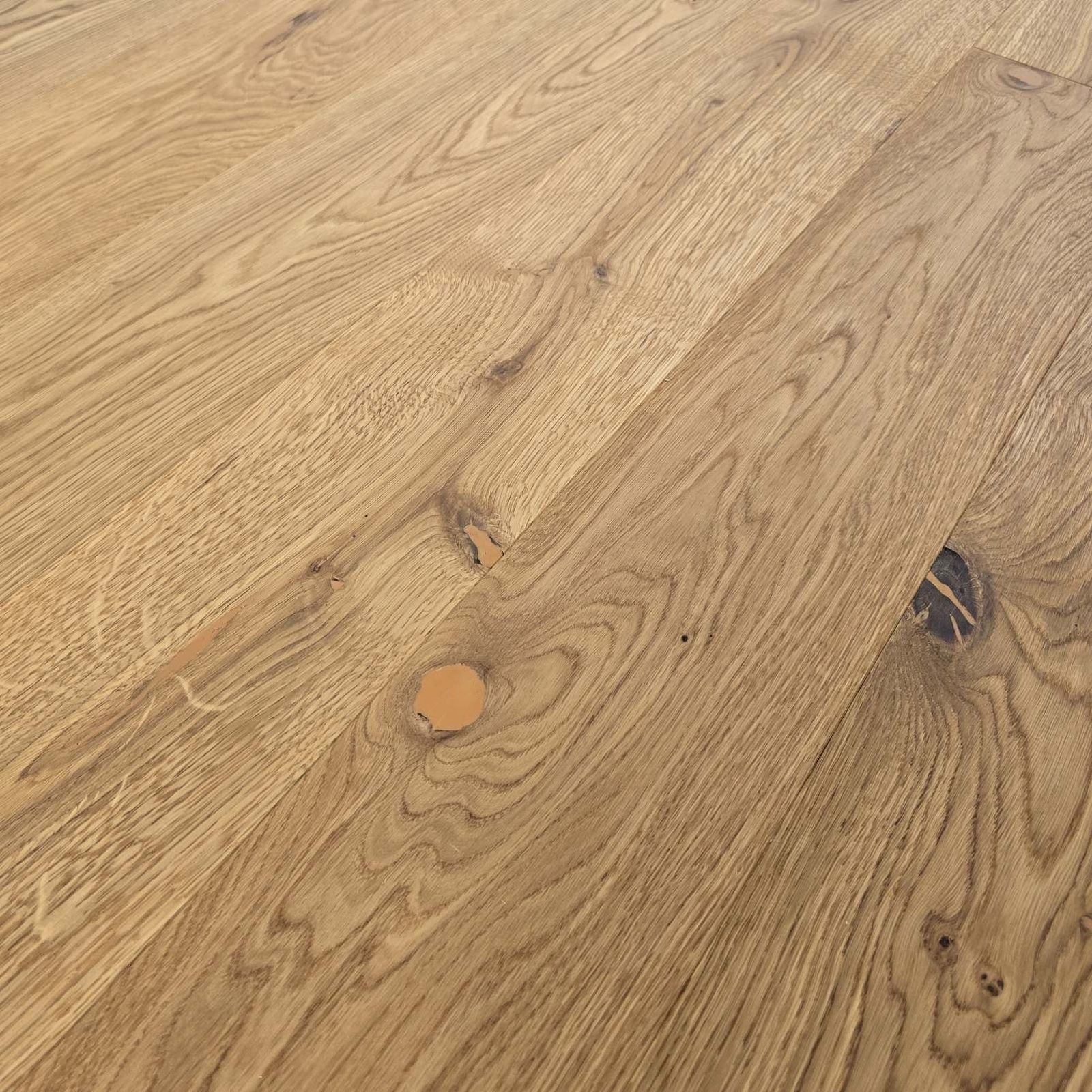 Das Holz hat ein rustikales Erscheinungsbild mit lebendigem Farb- und Strukturspiel sowie einem, der Holzart entsprechend hohem Anteil an Ästen und Splintholz. Vermehrt vorkommende Äste und Risse sind farblich passend ausgebessert.