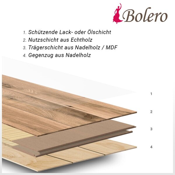 3-Schichtparkett verfügt über eine Nutzschicht, Mittellage und einen Gegenzug, der die gesamte Konstruktion von unten schützt. Das Parkett ist besonders formstabil und reduziert Fugenbildung zwischen den einzelnen Dielen. Die Verlegeelemente sind meistens geölt oder lackiert und können zwei- bis dreimal abgeschliffen und mit einem neuen Oberflächenschutz versehen werden. |